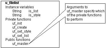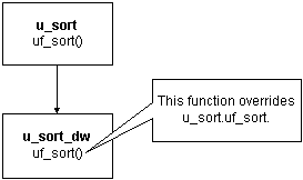 Example of virtual function in ancestor object Another example of using inheritance in custom class user objects is creating an ancestor object containing functions for all platforms and then creating descendent objects that perform platform-specific functions. In this case, the ancestor object contains a virtual function (uf_change_dir in this example) so that developers can create descendent objects using the ancestor’s datatype.