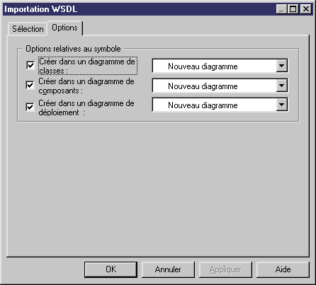 La page Options de la boîte de dialogue Importation WSDL inclut les éléments suivants :