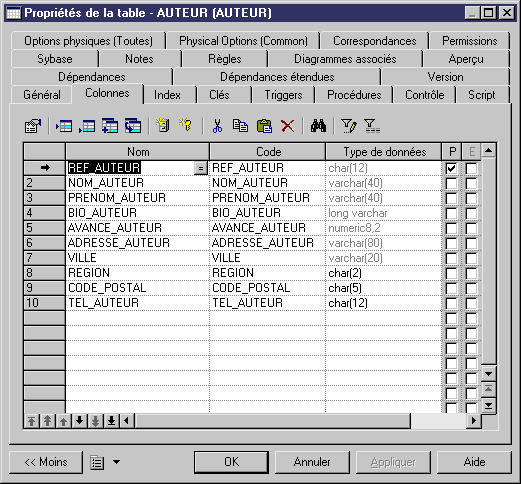 Par exemple, lorsque vous cliquez sur l'onglet Attributs dans la feuille de propriétés d'une classe, vous affichez la liste des attributs de cette classe.