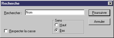 Lorsque vous ouvrez une liste et que vous cliquez sur l'outil Chercher une ligne, la recherche s'effectue automatiquement sur la première colonne de la liste car celle-ci est sélectionnée par défaut.