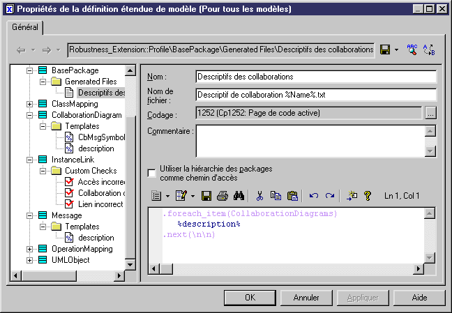 du template définie sur la métaclasse CollaborationDiagram. Le code du fichier généré contient également une macro foreach_item macro afin de boucler sur les différents diagrammes de collaboration du modèle.