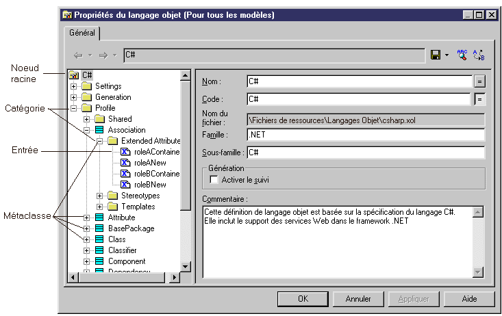 L'éditeur de langage objet permet de naviguer entre les différentes catégories et entrées du langage objet. Selon l'élément sélectionné, le contenu de la partie droite de la fenêtre change. Le terme Métaclasse est utilisé dans la documentation PowerAMC pour identifier un objet en tant que métaclasse. Les métaclasses contenues dans l'arborescence de l'éditeur de ressources sont des catégories.