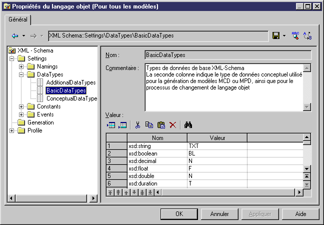 | BasicDataTypes | Types de données de base de langage objet. La colonne Valeur indique le type de données conceptuel utilisé pour la génération de MCD et de MPD. BasicDataTypes représente les types de données les plus utilisés |