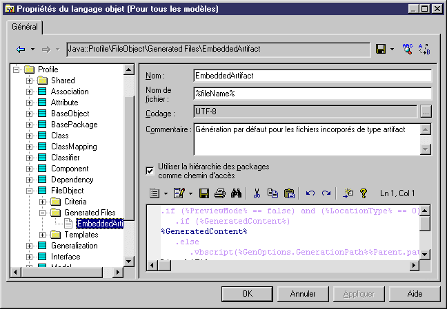 La catégorie Generated Files pour les objets fichiers dans Java contient l'entrée EmbeddedArtifact qui s'applique à tous les fichiers incorporés de type Artifact à générer. L'entrée EmbeddedArtifact contient la zone Nom de fichier qui contient le template pour le nom des fichiers à générer.
