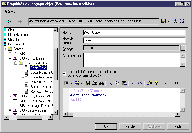 Dans cet exemple, aucun fichier n'est généré car le contenu de la zone Nom de fichier commence par un caractère . (point). Le contenu du fichier n'est disponible que dans la page Aperçu de la feuille de propriétés du composant (EJB - Entity Bean).