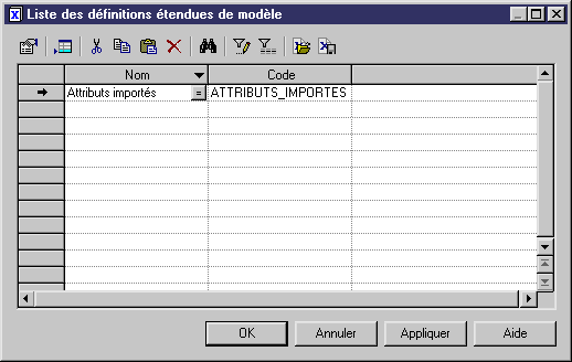 Lorsque vous ouvrez un modèle enregistré avec PowerAMC version 5 ou 6, et que ce modèle contient des attributs étendus, ces derniers sont automatiquement importés dans une définition étendue de modèle spécifique incorporée au modèle importé.
