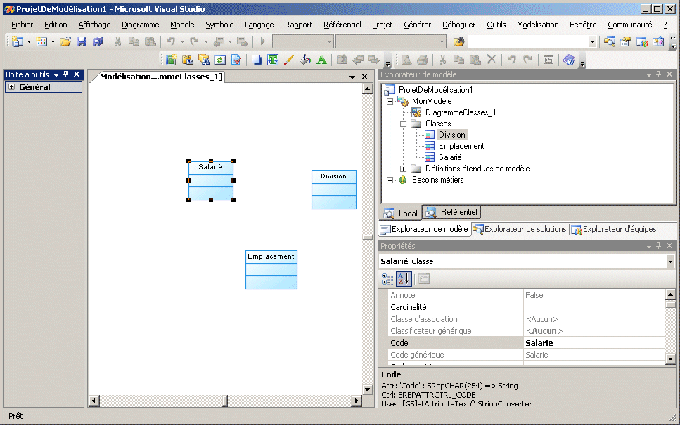 - Le fenêtre Propriétés équivaut à une feuille de propriétés PowerAMC, et répertorie les propriétés de l'objet sélectionné. Les feuilles de propriété standard de PowerAMC sont également disponibles.