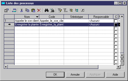 La boîte de dialogue Liste des objets inclut tous les objets d'un type donné du package ou modèle courant.