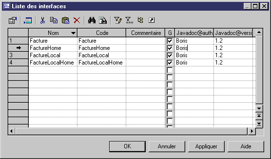 Vous pouvez également afficher et modifier des attributs étendus dans des listes d'objets, mais vous devez changer pour ce faire l'affichage par défaut en utilisant l'outil Personnaliser les colonnes et filtrer dans la barre d'outils de la liste. Dans l'exemple suivant, certains attributs étendus javadoc sont affichés dans la liste des interfaces.