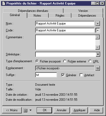 Pour plus d'informations sur la création d'un objet fichier depuis le menu contextuel d'un symbole dans le diagramme, reportez-vous à la section "Liaison d'un objet fichier à un objet de PowerAMC".