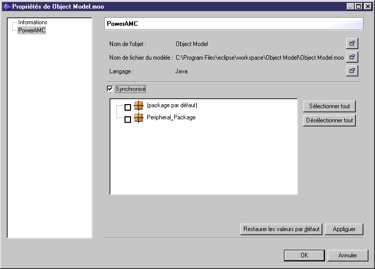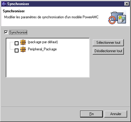 - Cochez la case Synchronisé pour activer la zone de synchronisation et cochez les cases correspondant aux packages que vous souhaitez synchroniser avec leur code source. Le package par défaut regroupe tous les objets situés à la racine du modèle.