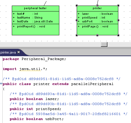 Le fichier de code source de la classe printer s'affiche dans une vue, juste au-dessous du diagramme.