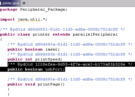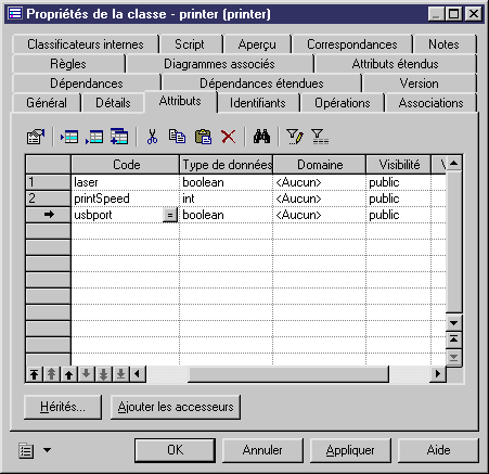- Double-cliquez sur le symbole de la classe printer, cliquez sur l'onglet Attributs, puis ajoutez un attribut usbPort avec un type de données boolean et une visibilité public.