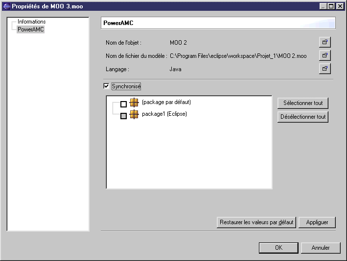 Dans l'Explorateur de modèles, créez un premier MOO ayant pour cible Java. Dans ce premier modèle, créez un package et synchronisez-le.