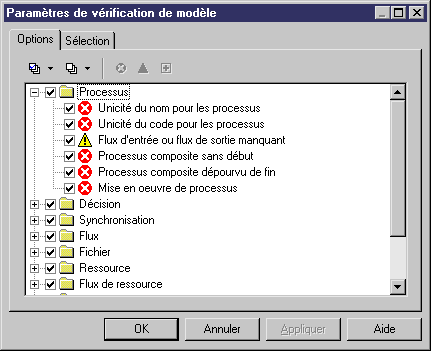 Les paramètres d'objet contrôlés lors de la vérification s'affichent avec des symboles indiquant un degré de sévérité du problème.