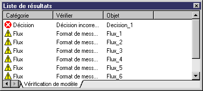 La fenêtre Liste de résultats affiche les messages d'erreur et les avertissements générés en fonction des options de vérification que vous avez définies.