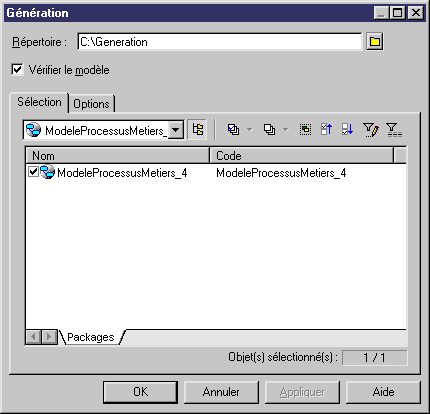 Vous pouvez sélectionner les objets à générer dans l'onglet Sélection de la boîte de dialogue de génération. Ce onglet contient des sous-onglets permettant d'afficher les différents types d'objet du modèle.