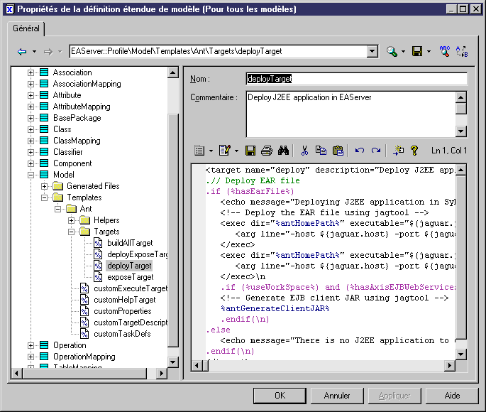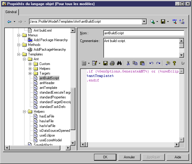 Le fichier généré spécifique à Ant et les templates de génération sont définis dans la métaclasse Model, sous le noeud Profil.