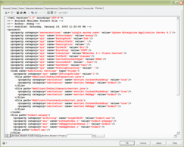 Vous pouvez afficher un aperçu du fichier de projet JBuilder, du fichier de groupe d'EAR et des fichiers de groupe d'EJB à générer depuis PowerAMC.