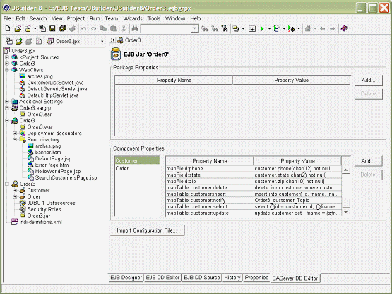 JBuilder permet aux utilisateurs d'éditer les propriétés de configuration Sybase EAServer. L'écran suivant montre un exemple de propriétés de correspondance O/R générées par PowerAMC pour l'EJB Customer.