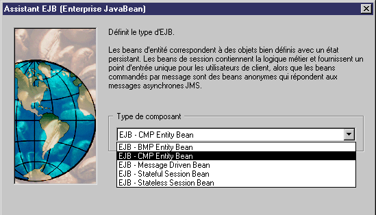 Pour convertir une classe en EJB, vous pouvez pointer sur la classe, cliquer le bouton droit de la souris, puis sélectionner la commande Créer un EJB (Enterprise JavaBean) ou bien utiliser la commande Outils→Créer un EJB (Enterprise JavaBean). L'Assistant EJB crée un composant pour représenter l'EJB :