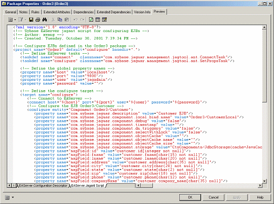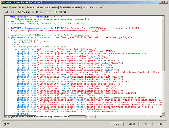 Avant de générer des EJB pour EAServer, vous pouvez afficher un aperçu du descripteur de configuration pour vous assurer qu'il est correctement défini.