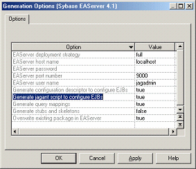 Le descripteur de configuration peut être ajouté dans le fichier JAR d'EJB. Lorsque vous déployez un JAR d'EJB sur EAServer, toutes les propriétés seront définies, y compris la correspondance O/R. Vous pouvez également utiliser la commande jagtool pour configurer les EJB avec le descripteur de configuration.