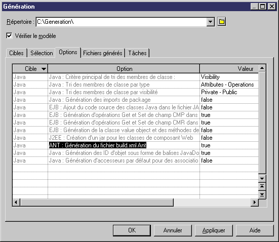 Pour générer un script de compilation Ant, vous devez créer un Modèle Orienté Objet (MOO) pour le langage objet Java, et activer la génération de script de compilation Ant (cette dernière est désactivée par défaut).