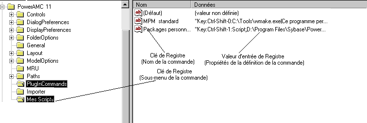 Les commandes personnalisées sont enregistrées dans le Registre. Vous pouvez définir des valeurs pour les commandes personnalisées dans la catégorie CURRENT USER du Registre ou bien dans la catégorie LOCAL MACHINE du Registre.