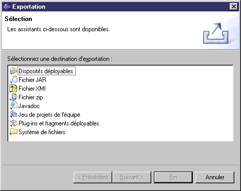Dans la vue Navigateur, pointez sur le projet Eclipse correspondant, cliquez le bouton droit de la souris, puis sélectionnez Exporter dans le menu contextuel. Une boîte de dialogue Exporter s'affiche.