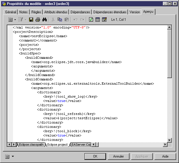 - Cliquez sur l'onglet Eclipse.project pour afficher un aperçu du fichier .project d'Eclipse.