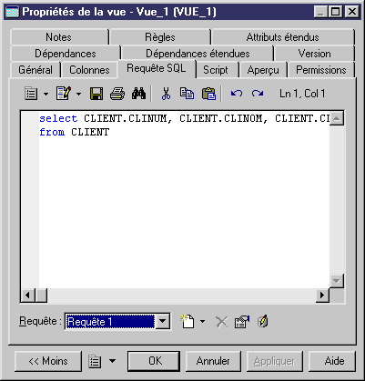 Si vous créez une vue sur le synonyme CLIENT, la requête de la vue affiche les ordres de sélection portant sur le contenu de la table :