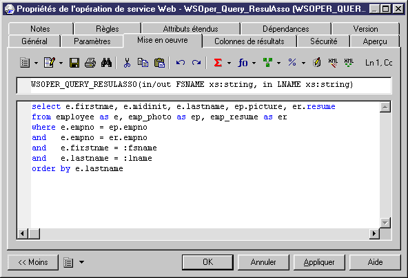 L'onglet Mise en oeuvre d'une feuille de propriétés d'opération Web permet de saisir une instruction SQL pour le service Web. Vous pouvez utiliser les outils suivants pour spécifier de cette instruction :