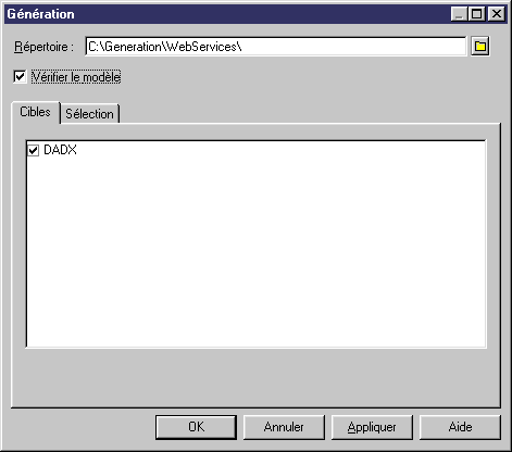 - Sélectionnez Outils→Génération étendue pour afficher la boîte de dialogue Génération avec DADX sélectionné.