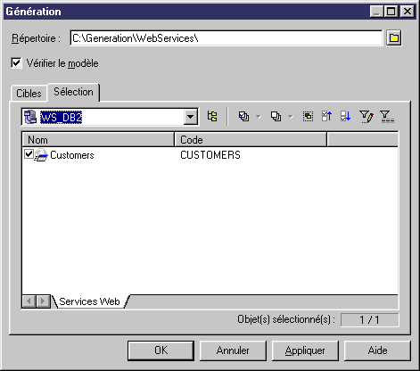 - Cliquez sur l'onglet Sélection, puis sélectionnez les services Web pour lesquels vous souhaitez générer un fichier DADX.
