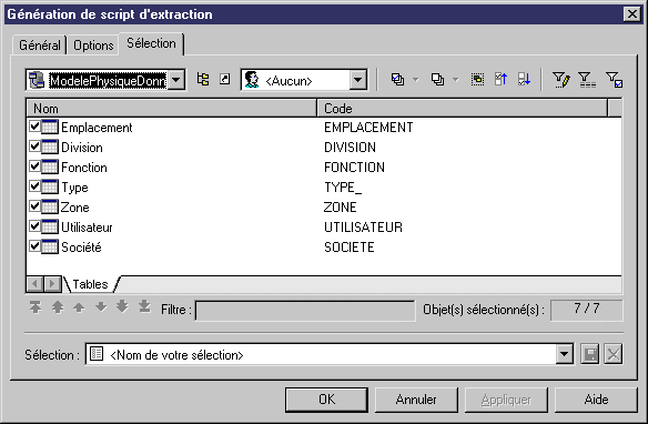 L'onglet Sélection permet de spécifier les tables à inclure dans le script.