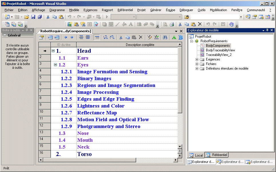 Une fois que vous avez créé un modèle de gestion des exigences, vous pouvez exporter vos exigences dans un projet Team System sous la forme d'éléments de travail. Les exigences exportées conservent trace de leur emplacement dans la hiérarchie des exigences :