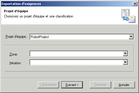 - L'écran Projet d'équipe s'affiche afin de vous permettre de spécifier vers quel projet vous allez exporter vos exigences ainsi, le cas échéant, qu'une Zone et/ou une Itération, si ces dernières ont été définies pour le projet.