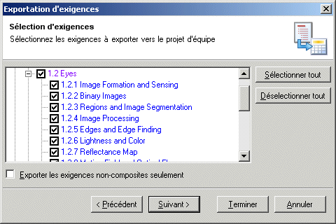 Spécifiez une exigence à exporter en cochant la case correspondance. Si vous cochez la case Exporter les exigences non-composites seulement, seules les exigences dépourvues d'enfant seront exportées.