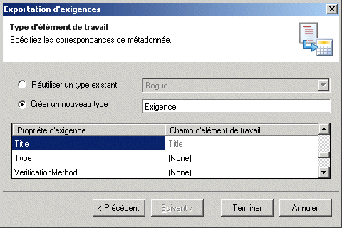 - Cliquez sur Suivant pour continuer. L'écran Type d'élément de travail permet de spécifier le type d'élément de travail vers lequel vos exigences seront exportées. Sélectionnez un type existant, ou créez-en un nouveau.