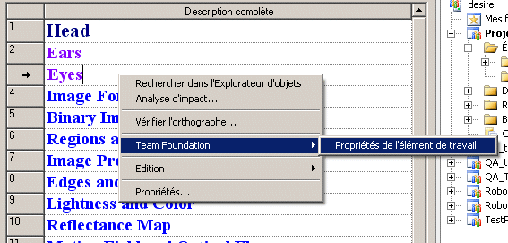 Pour naviguer vers un élément de travail d'exigence particulier (lié via une lien de traçabilité à une exigence de MGX), pointez sur l'exigence dans une vue Document des exigences de MGX, cliquez le bouton droit de la souris, puis sélectionnez Team Foundation→Propriétés de l'élément de travail dans le menu contextuel :