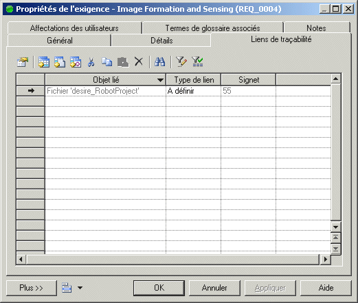 Vous pouvez également visualiser les liens vers des éléments de travail en affichant la feuille de propriétés d'une exigence et en cliquant sur l'onglet Liens de traçabilité. Sélectionnez le lien approprié et cliquez sur l'outil Propriétés pour aller à l'élément de travail associé :