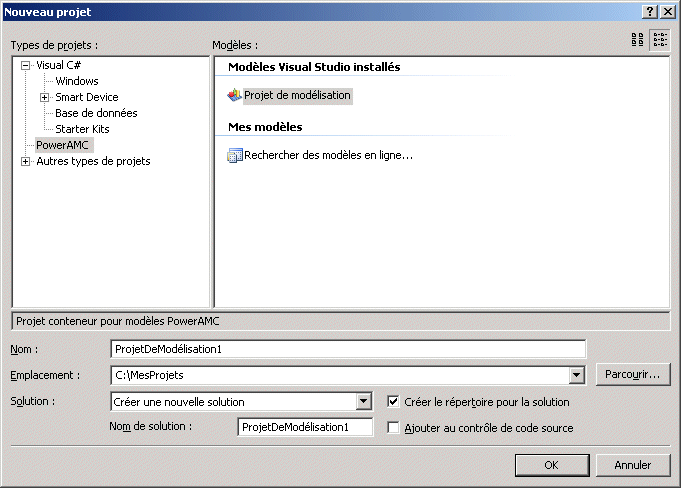 - Sélectionnez PowerAMC dans le volet Types de projets, puis sélectionnez Projet de modélisation dans le volet Modèles.