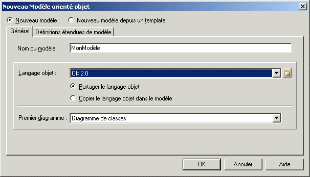 - Sélectionnez le type de diagramme dans la liste Premier diagramme. Le premier type de diagramme sélectionné reste mémorisé : la prochaine fois que vous créez un nouveau modèle, c'est ce type de diagramme qui sera proposé par défaut dans la liste Premier diagramme.