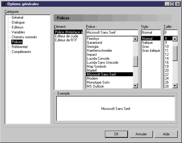 - Sélectionnez Outils→Options générales puis sélectionnez la catégorie Polices dans l'arborescence Catégorie.