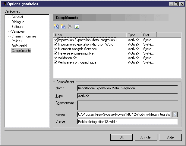| Nom | Nom du complément, ce nom doit être unique dans l'environnement PowerAMC. Les noms de complément système ne peuvent pas être modifiés |