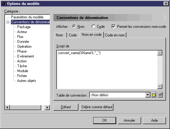 Vous pouvez définir des scripts de conversion pour générer le nom d'un objet à partir de son code et réciproquement en utilisant des scripts et des tables de conversion. Les conversions nom/code doivent être appliquées à tous les objets nommés dans un modèle, ou bien à chaque type d'objet individuellement.
