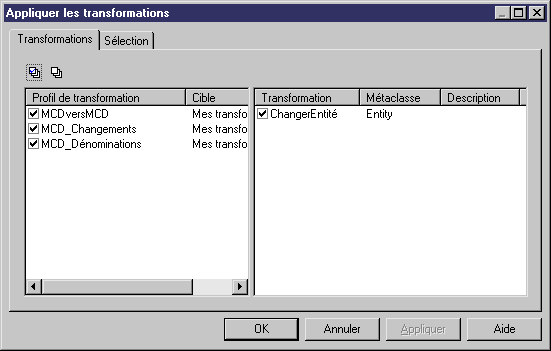 - Sélectionnez des profils de transformation et des transformations sur l'onglet Transformations.