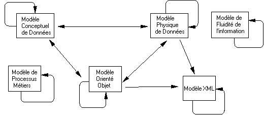 Vous pouvez lier des modèles en utilisant les fonctionnalités de génération et de synchronisation de modèle. Les liens contenus dans l'illustration ci-dessous représentent les différentes générations possibles entre les modèles PowerAMC :