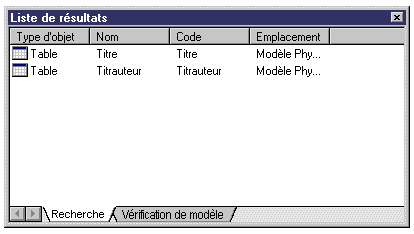 Les messages de recherche s'affichent dans le volet Résultats, dans la partie inférieure de la fenêtre de PowerAMC.
